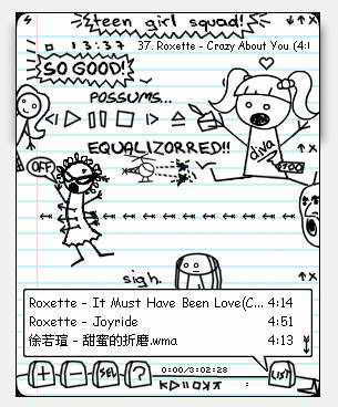 推荐的第三款皮肤是一款非常个性化的皮肤(图6),整个皮肤就像是读书时练习本上某一页的涂鸦作品,简单的黑色线条加上被改成铅笔状的鼠标指针,给人的感觉仿佛就是刚刚画上去的。各种控制按钮隐藏在画面的细节里,比如小女孩的左右发卡分别控制着显示EQ面板和播放列表窗口。拥有这样一款皮肤是不是又让你想起了读书时的快乐时光呢?