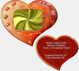 针对情人节我们推荐的是WMP自带的名为“heart”的皮肤(图7),整个界面的主体是一个大大的红心,所有的控制按钮都做成小心形的样子。最具特色的是单击播放列表或其他控制按钮时弹出的控制窗口也是一颗大大的红心样子,所以建议大家在播放歌曲时打开信息窗口,这样就会有两颗红心出现在桌面上。不仅可以在听歌的同时查看到歌曲信息,而且也非常适合情人节心心相印的主题。