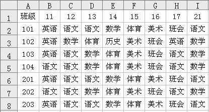 2.在“总课表”工作表中,按如图1所示的样式,建立总课表,并将各班级的课程内容输入到相应的单元格中。A列中是班级号,104代表初一年级四班;第一行中是课程序号,16代表星期一第六节课。