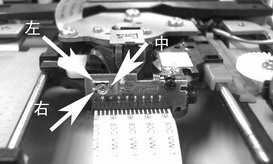 2.把连接激光头组件的排线拆除,通常情况下排线都以插入的方式扣在插槽内的,在拆除时力量不要太大,以免将排线弄断。拆除排线以后,将激光组件反扣过来,可以看到可变电阻就在排线的上方(图3)。