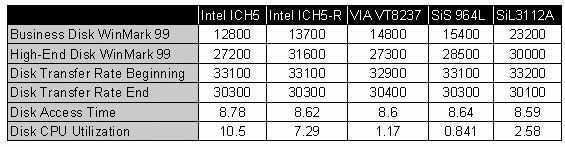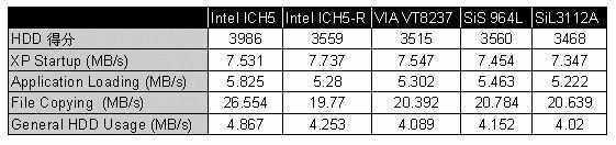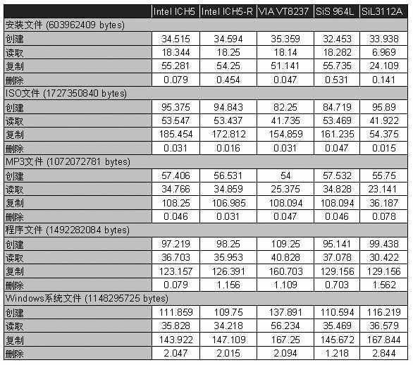 ICH5的磁盘性能出乎意外地高,除没有优化过的Windows XP 开机时间外,各方面性能均高于其他的南桥和独立控制器5%以上。文件复制性能甚至领先对手25%。