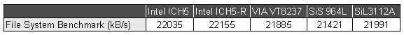 我们选择其中的File system benchmark 测试对系统磁盘性能进行考查。 Intel的ICH5和ICH5-R依然性能名列前茅,不过并没有占到太大的便宜,即使离最差的SiS964也不过领先3.4%。