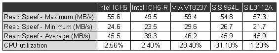 SiS和VIA的表现再度引起了我们的关注,这倒不是因为表现出众,CPU占用率在28%以上的表现让我们大为吃惊,这个数字分别是Intel ICH5和外置的SATA控制芯片SiL3112A的11和23倍。