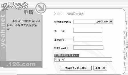 在主界面的“域名参数设置”中,选择一个域名后缀,然后点击“申请”按钮,连接到网易免费域名申请页面,在此点击“开始申请”按钮,进入“请填写申请表”页面(图1)。大家一定注意“您想转向的主页地址”这个选项,需要填写“个人网页服务器”程序中显示的服务器网址,而不是本机当前联网IP。