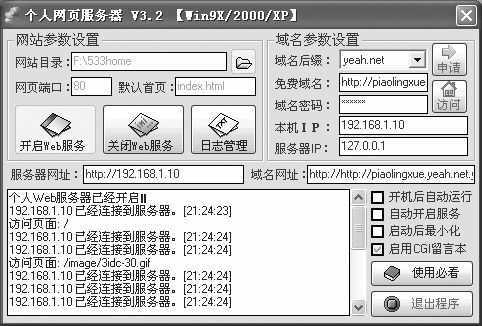 另外,程序还支持使用CGI留言本。大家可以在程序中勾选“开机后自动运行”、“自动开启服务”及“启动后最小化”复选框。此后,该程序将随系统自动运行,网友们通过网站域名就可永久访问你的主页了。