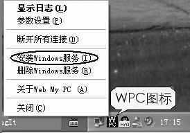 设置好WPC后点击“确定”按钮,稍等片刻WPC就会登录到服务器上,并在系统托盘上显示出WPC图标(图2),在图标的右键菜单中点击“参数设置”可以重新进行设置,选择“安装Windows服务”可以将WPC设置成Windows服务并且开机自动启动WPC。至此WPC被控端就设置OK了。