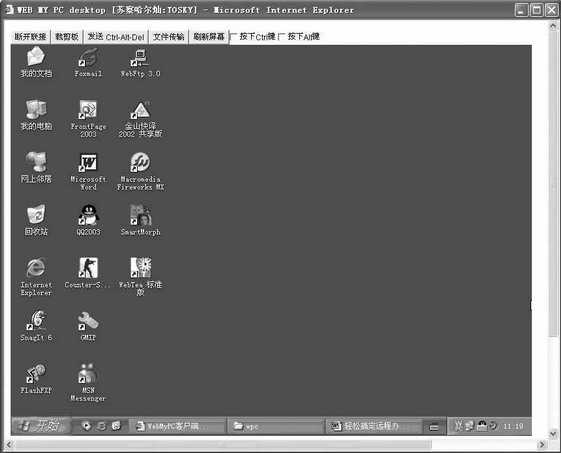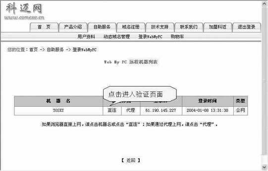 要想连接被控端电脑,必须确定控制端电脑安装了Java虚拟机。一般Windows98/Me/NT/2000都已内置了Java虚拟机,如果你使用的是Windows XP,可以先在http://aonow.net/soft/down.asp?id=1625&no=1处下载安装。然后登录http://www.dns0755.net/login.php?page=wpc,输入用户名和密码,点击“登录”进入远程机器列表页面(图3),点击“直连”进入验证页面,输入私人密码并按“确定”就会看到被控端的电脑桌面了(图4)。接下来你就可以像操作本地电脑一样控制被控端的电脑进行办公。由于网络的带宽不同,各地的速度也会有相应的差异。