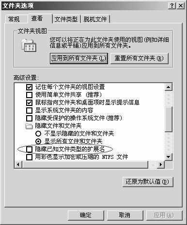 4.改变文件的查看方式,让文件显示完整的扩展名,使病毒无处藏身。病毒常用后缀为:.bat, .cmd, .exe, .pif, .scr,.zip。