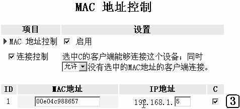 在“MAC地址控制”中,主要有两方面的功能设置,一个为连接控制的设置,可以通过它来设定允许或者禁止哪些计算机能够访问路由器或者Internet;另一个为MAC地址与IP地址绑定,防止用户随便更改IP地址,或者能够使使用某个MAC地址的用户每次都获得相同的IP地址。
