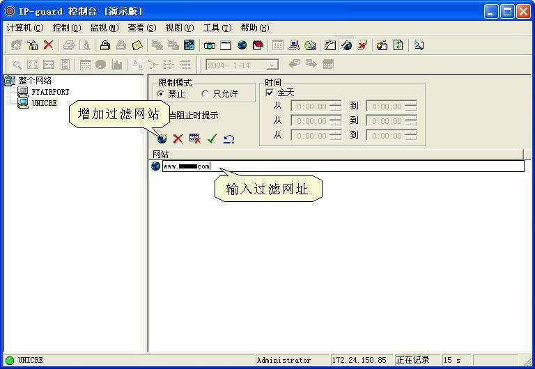 利用IP-guard我们还可以有效地控制用户使用非指定的应用程序和对用户浏览的网站进行过滤。这里我们以网站过滤为例来说明这个功能的使用,点击“查看→过滤的网站”进入网站过滤设置窗口(图3),设置好过滤网站并勾选“当阻止时提示”后,如果用户再访问被过滤的网站时就会弹出IP-guard的提示网页。过滤被控机的应用程序操作与此相同,这里就不再赘述了。