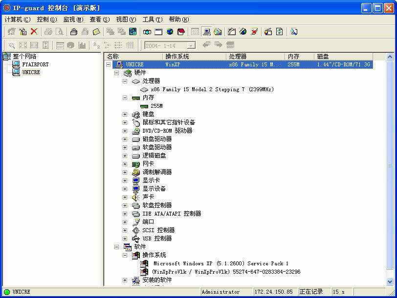 利用IP-guard我们还可以轻松地查看局域网内的各台客户机的软硬件配置。选择被控机,点击“查看→配置信息”,被控机所有的硬件、软件配置便一目了然地显示出来了(图4)。方便了我们对局域网软硬件资源的统计。