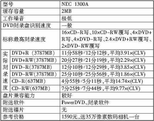 尽管这款NEC 1300A的产地为马来西亚而不是日本本土,但是我们还是能够一眼看出它与中国台湾地区产品在造型上的差异──下面板设有散热孔,用材扎实(从重量就可以感受到)。1300A的DVD+RW覆写速度为2.4×,CD-R/RW刻录速度也不快,16×/10×,不过都是CLV恒定线速度方式,而且写盘相当稳定,实际刻录速度也非常快,DVD+R实刻可达到3.91×,是参测产品中最快的。同时,这款产品使用时异常安静,即使在深夜也听不到太大声响,而且几乎没有震动。