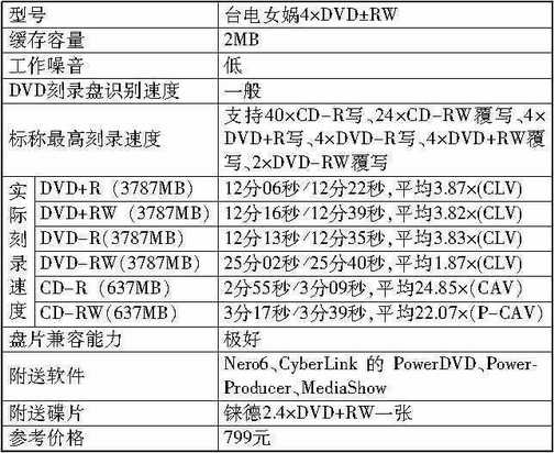 早期固件版本的女娲4×DVD±RW不能在Nero CD-DVD Speed中模拟CD+R的写测试,而在升级到0048版后,这些问题已经得到了良好的解决。目前这款刻录机的价格为999元,但据厂商透露,这款台电女娲4×DVD±RW在本周将价格进一步降到799元,还附送Nero、PowerDVD、DVD制作软件PowerPorducer、MediaShow和铼德的2.4×DVD+RW刻录盘,相当具有性价比。