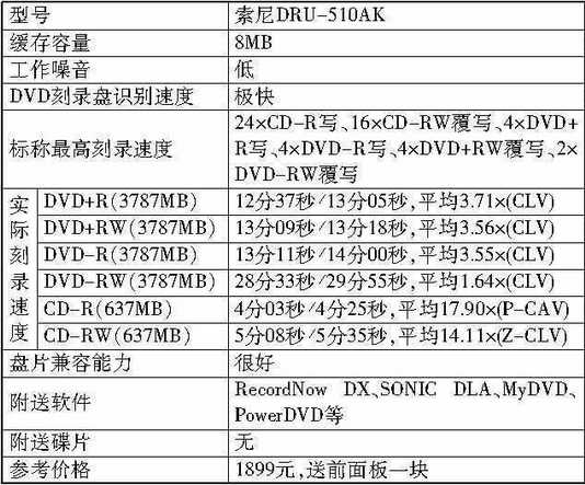 采用乳白色+银色前面板的DRU-510AK依旧保持了索尼惯有的风格,带有8MB超大缓存。在DVD刻录速度方面,将DVD+RW的刻录速度从DRU-500A的2.4×提升到了4×,从而达到了4×/4×/4×/2×,而CD-RW的覆写速度也从500A的10×提升到了Ultra Speed的16×。DRU-510AK的盘片兼容性非常好,在兼容测试中,只有一种DVD刻录碟无法被正确识别。而DRU-510AK给人印象最深的是它超快的DVD刻录盘识别速度。参测产品中,其他各款产品均要8~15秒才能识别出刻录碟信息,而DRU-510AK在盘片进仓后仅要6秒就可以识别出。