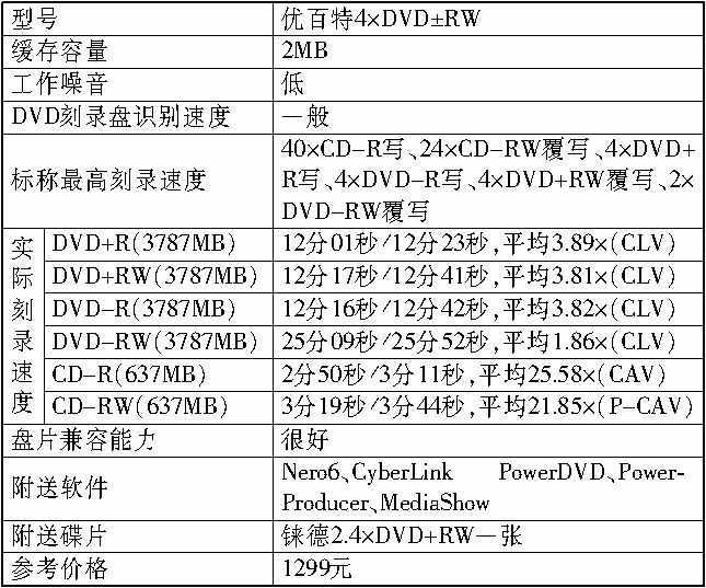 优百特双模式DVD刻录机的速度指标也非常高,具有4×/4×/4×/2×的DVD刻录速度和40×的CD-R写,以及Ultra Speed的24×CD-RW覆写,不过很有意思的是,它的包装盒上将DVD-R的速度误写为了2×。