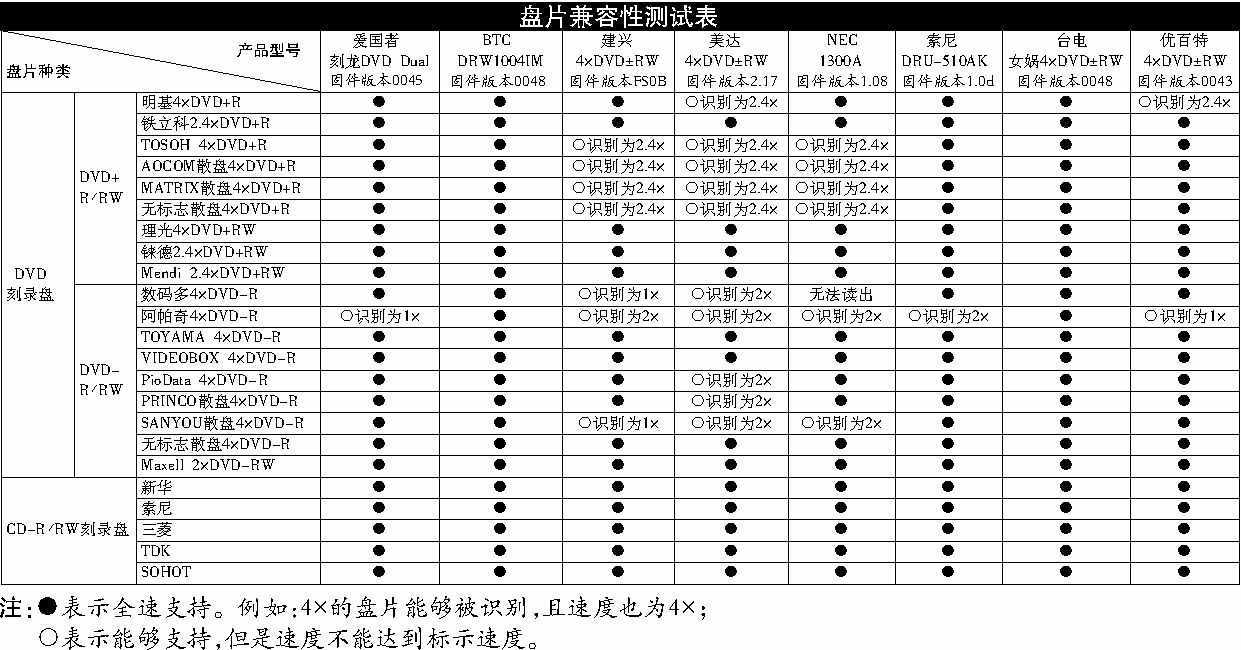 测试用碟片:明基、铁立科、TOSOH、AOCOM、MATRIX、理光、铼德、Mendi、数码多、阿帕奇、TOYAMA、VIDEOBOX、PioData、PRINCO、SANYOU、Maxell、阳光诱电等