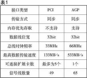 一般来说显卡分为PCI接口和AGP接口,前者是从ISA接口发展而来的,它快速淘汰了ISA接口,然后人们为了能添加更多类型的硬件,在PCI 1.0的基础上加入了PCI 2.0甚至PCI 2.1~2.3标准。这样虽然提升了PCI接口的性能,但作为目前的图形接口,它已经力不从心。因为它一般情况下只有33MHz的运行频率(表1),所能提供的数据通道较为狭窄,而显卡通过PCI总线对系统内存进行的操作将占用大量的PCI总线带宽,这对于目前接口带宽需求非常高的显卡来说限制是很大的,因此AGP这种专门为高性能图形显卡设计的接口便应运而生了。