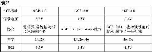 AGP接口在更新版本的同时,它的各项参数也在不断发生变化,目前AGP已经发展至3.0的版本。不同版本之间的接口电压、接口速度也不尽相同,具体参数见表2。
