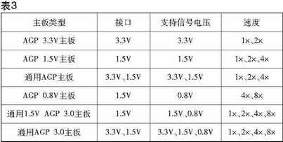 也许有些玩家还记得当初从AGP 1.0升级到AGP 2.0时,导致一些主板和显卡出现的兼容性问题。通用AGP主板标准解决了这个问题,它可以支持3.3V和1.5V的信号电压。但不久之后,主板生产商不再执行这个标准,所以很多3.3V信号电压的显卡就没有办法使用了。一些使用3.3V信号电压的AGP 1.0兼容显卡被当作AGP 2.0兼容显卡销售,导致很多主板烧毁。为了防止用户将非0.8V显卡使用在AGP 0.8V插槽上,Intel专门为AGP 3.0插槽和主板增加了电子ID。不过AGP 3.3V信号电压的显卡依然不能使用在“通用1.5V,AGP 3.0主板”上,这种主板只能支持1.5V和0.8V信号电压(表3)。因此我们在升级之前必须搞清楚自己的主板芯片组到底支持哪个AGP版本。主要是注意相关的电压、是否是通用AGP主板,一定要对号入座,不然轻则导致兼容性问题,重则烧毁板卡。