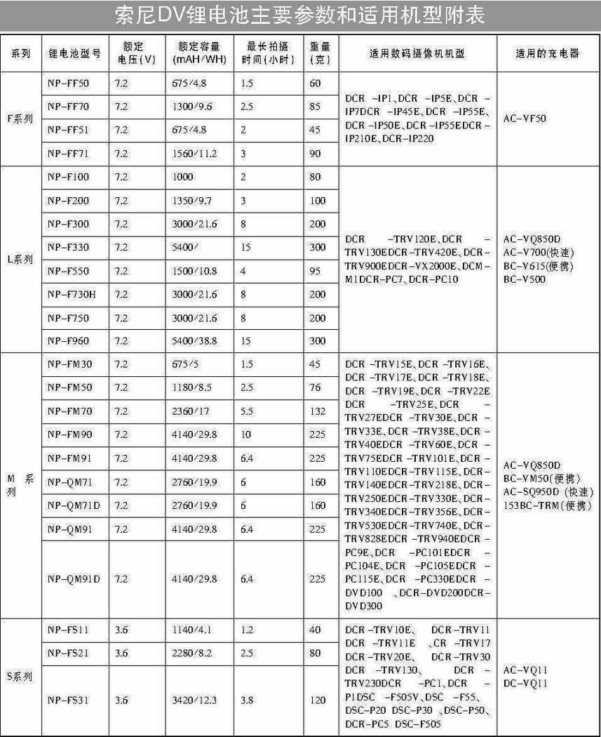 下面收集整理出索尼DV所采用的锂电池的主要参数和适用机型(包括最新和发烧级机型)表,供读者们查阅。