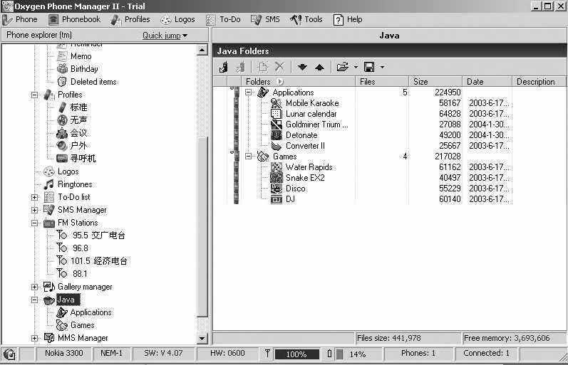 方法二:利用手机内存管理软件删除死尸程序。首先下载手机内存管理软件Oxygen Phone Manager或相应手机品牌的管理软件,再用相应的数据线和电脑相连(下载、安装和连接请看《电脑报》2004年2月2日第4期D8版《用好手机的JAVA功能》),驱动安装完成重启电脑,就能在“我的电脑”中管理手机内存,当然你也可以删除死尸文件(图2)。此法在实践中成功率很低,原因是有些品牌手机提供的数据线不具有访问内存的能力,内存管理软件安装后不能识别手机。例如诺基亚3300需要F- USB线与电脑连接,而F- USB线极少出售。