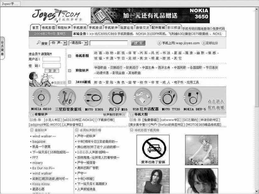 方法三:覆盖安装。首先安装游戏和应用程序占满应用程序目录空间,然后再上网下载安装游戏程序。由于需要用手机上网,你的手机卡一定要开通WAP或GPRS功能。具体步骤如下:先到网站www.joyes.com (图3)上找到你想要下载的适用于自己手机的JAVA程序,然后记下它的编号。再操作手机:功能表→服务→选择地址(写上JOYES的WAP地址)→进入→WAP下载直通车(提示:请输入你要下载的图片、铃声或游戏的编号),这时填入要下载的游戏编号后确定就可以了。打开后,会出现文件的大小和版本号,还会出现提示:“安装软件太多删除一个?”选中那个死尸程序,会出现这个文件的详细资料,确认后会出现提示:“一项被标记,继续?”确认后就可以直接下载游戏把那个死尸程序覆盖了。