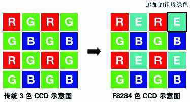另外,索尼此次在该机型中的CCD感光元件融合了4原色技术,这是业界一种崭新技术,相对于传统的3原色感光器件而言,4原色感光器件增加了“翠绿”标准。据索尼官方宣称,这种新的4原色技术可以使得数码相机还原出更为真实的色彩效果。为了能够将4原色数据过滤成传统的3原色数据并进行处理(图2),索尼还推出了全新的“真实影像处理单元──Real Imaging Processor”,可完成4原色的数据转换,还对相机实际性能以及降低电能消耗有帮助。