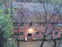 冬末的清晨,霜露未退,屋顶的瓦片上湿漉漉的,并显出一缕青黑。许多树木已经只剩下了光秃秃的枝干,干枯的树叶稀稀拉拉的散落在屋顶或者泥土里面自己腐烂,为春天的发芽提供肥料。照片中的色彩还原十分真实,特别是在清晨光线条件不足的情况下。