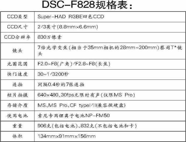 索尼DSC-F828展现了许多的新技术和功能:4原色技术、7倍光学变焦、双存储介质,以及最快1/3200秒的快门。另外,F828在手动功能的调节和内部程序软件上都作了很大的优化,使操作者更加方便和灵活控制这部机器。在成像质量方面,800万像素和“真实影像处理单元──Real Imaging Processor”提供了强大的后盾,实在是数码爱好者和摄友们的良友。