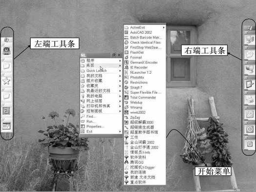 安装好并运行程序后,将鼠标指针移动到屏幕左、右两侧的边缘,会分别弹出相应的快捷工具条。默认情况下右侧的工具条中包括“我的电脑”、“我的文档”、“控制面板”、“注销”、“重启”、“关机”等常用的功能按钮,而左侧的工具条则为空白(在工具条的最上方双击鼠标左键,可将工具条卷起)。此外,在桌面上双击鼠标左键,还能够调出一个包含开始菜单中所有项目的菜单(图1),使用起来相当方便。