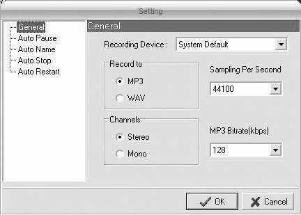 首先,确定本次录音的输出格式。点Setting按钮打开设置对话框(图2),在General选项卡里设置好输出的格式(一般设置为MP3)、Channels声道类型(一般设置为Mono单声道,如选Stereo立体声会使录制的文件过大)、采样率为44100、MP3码率为128Kbps,设置成默认就行了。