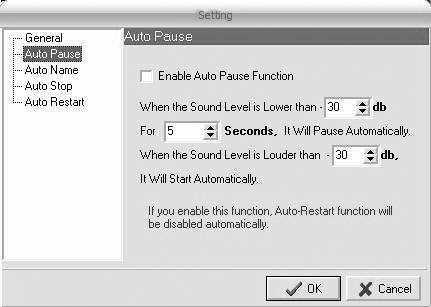 把“Enable Auto Pause Function”勾选上,默认的设置是当声音电平低于30dB时声音持续5秒,录音将自动暂停,当声音高于30dB时,录音自动开始。也就是说,我们在录音的时候,不用去按开始录音和暂停录音按钮,只要对着麦克风用力讲话,就会启动录音,停止说话超过5秒,录音就会自动停止。这个功能是不是很实用?