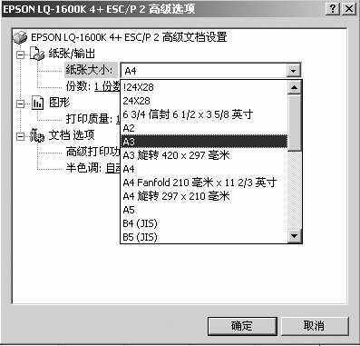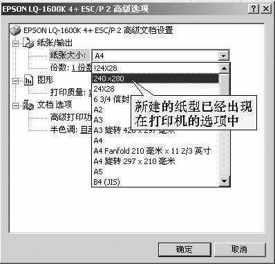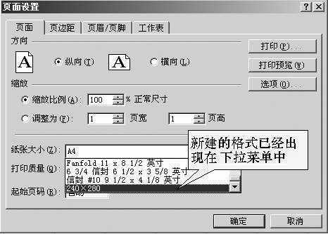 为了验证一下设置是否成功,我们可以再次运行Excel 2002,进入“页面设置”对话框,在“页面大小”下拉菜单中出现了新格式(图4);在打印机的“高级选项”对话框中也可以看到刚才设置的名为“240×280”的纸张格式(图5)。