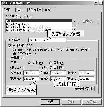 首先,在“格式描述”框中给新创建的格式命名,例如240×280(或其他名称);然后选择“公制”度量单位,输入自定义的纸张大小(宽度为24.10cm,高度为28.00cm),再设置好打印的页边距(建议保持默认值即可);最后点击“保存格式”按钮,刚才新建的纸张格式便保存在格式列表中了。