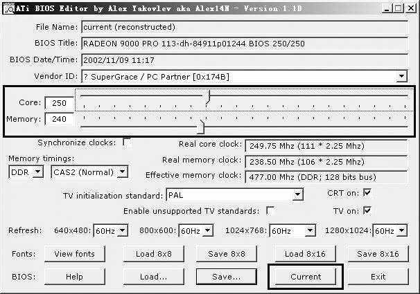 用RadEdit (V1.1D版,http://www.radeon2.ru/radedit_eng.html)(单击“Current”按钮)测出该显卡BIOS设置(如图1)(注:超频软件不影响该软件使用,因为超频软件并不能改变显卡的BIOS设置),如核心频率为250MHz、显存频率为240MHz等。因为DDR显存为双速率数据传输,所以其显存等效频率为480MHz。可见该显卡离Radeon 9000Pro芯片275 MHz的标准频率以及4ns显存500MHz的标准频率还有距离。