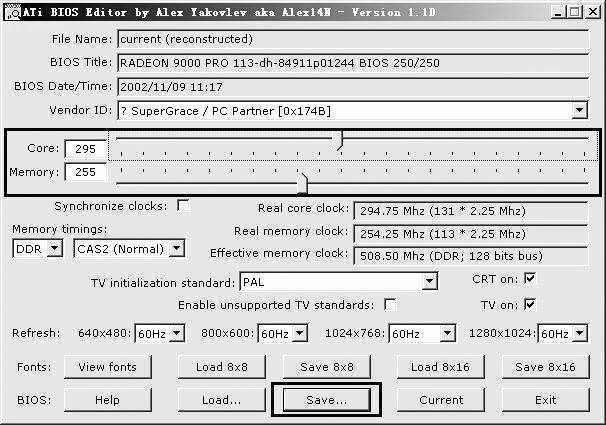 这一步应用的两个主要软件是RadEdit(V1.1D版)和ATi Winflash(Windows平台操作1.0.0.16版,http://drvshome.zz.ha.cn/dir83/d33524.htm)。RadEdit软件的突出功能是能够直接从显卡BIOS中提取BIOS文件并可修改BIOS文件,但不能直接对BIOS进行刷新;而ATi Winflash则通过载入BIOS文件刷新显卡BIOS。所以我们可以首先提取(单击RadEdit运行面板上的“Current”按钮)并保存(单击“Save……” 按钮)原始BIOS文件(.rom文件),以“9000P”命名作重要资料保存(有备无患)。接着分别移动面板上“Core”(核心频率)及“Memory”(显存频率)项的调整滑块 ,使“Core” 、“Memory”项的设置值分别为295和255(MHz)(如图2),再单击“Save……” 按钮,以“9000POC”为名保存一个已修改原核心和显存频率的新BIOS文件,并把它放在你最容易找到的地方(如桌面)。