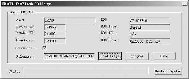 运行ATi Winflash,单击面板上的“Load Image”按钮,载入刚才建立的“9000POC”文件(如图3),确定后,单击“Program”按钮,约几秒钟后,程序提示更新成功,重启系统,显卡BIOS修改完成。