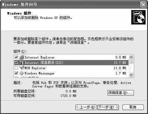 在“控制面板”中,双击“添加或删除程序”图标,在弹出窗口里点击“添加/删除Windows组件”按钮,弹出“Windows组件向导”窗口,在列表中勾选“Internet 信息服务(IIS)”复选框(图1)。如果点击“详细资料”按钮,在弹出窗口中可以分别选择SMTP服务器、FTP服务器等IIS子组件。