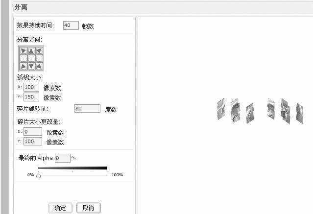4.在这个对话框中,你可以更改效果持续时间、分离方向、弧线大小、碎片旋转量等。设置好后,单击“确定”。等待一会,该程序进行计算并给图片加入效果。图层1的名称会自动改为“分离1”。