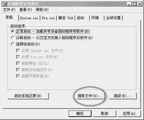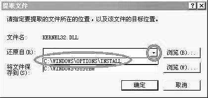 点击“开始→运行”,在输入框中输入“msconfig”后回车,会弹出如图1的界面。点击“提取文件”按钮,然后点击“浏览”在C:\Windows\System下找到Kernel32.dll并选取。再点“开始”,随后又会弹出一个窗口(图2),再点击“还原自”后的下拉菜单,有一个路径C:\Windows\Option\install,选中它后点“确定”就OK了。