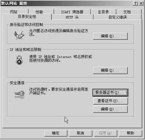 完成了证书服务的安装后,就可以为要使用SSL安全机制的网站创建请求证书文件。点击“控制面板→管理工具”,运行“Internet 信息服务(IIS)管理器”,在管理器窗口中展开“网站”目录,右键点击要使用SSL的网站,选择“属性”选项,在网站属性对话框中切换到“目录安全性”标签页(图1),然后点击“服务器证书”按钮。在“IIS证书向导”对话框中选择“新建证书”,点击“下一步”按钮,选择“现在准备证书请求,但稍后发送”。在“名称”输入框中为该证书取名,然后在“位长”下拉列表中选择密钥的位长。接着设置证书的单位、部门、站点公用名称和地理信息,最后指定请求证书文件的保存位置。这样就完成了请求证书文件的创建。