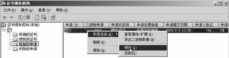 点击“控制面板→管理工具”,运行“证书颁发机构”。在主窗口中展开树状目录,点击“挂起的申请”项(图2),找到刚才申请的证书,然后右键点击该项,选择“所有任务→颁发”。颁发成功后,点击树状目录中的“颁发的证书”项,双击刚才颁发的证书,在弹出的“证书”对话框的“详细信息”标签页中,点击“复制到文件”按钮,弹出证书导出向导,连续点击“下一步”按钮,并在“要导出的文件”对话框中指定文件名,最后点击“完成”。