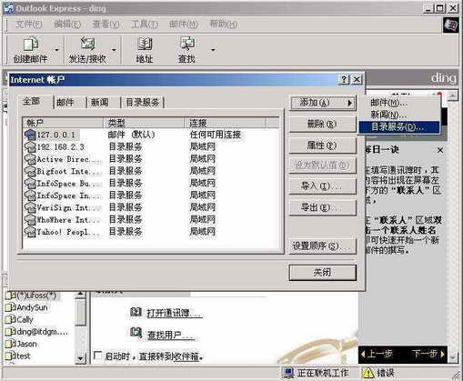 5.打开Outlook Express,选择“工具→账户”,回到账户设定画面,选定刚才添加的目录服务,选择“属性”。