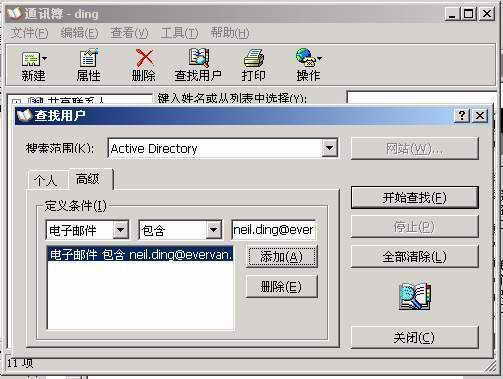 2.点击“查找用户”,在“高级”选项页中,选择查询字段为“电子邮件”,并根据需要选择查询条件,然后点“添加”,确定无误后选择“开始查找”(图4)。