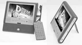 爱国者的新玩意儿:平板式DVD播放器。7英寸16:9液晶屏,可以播放DVD+/DVD-/VCD/CD/HDCD/CD-R/CD-RW/MP3/WMA 多种格式视频,并且带DTS/AC3杜比数字解码。播放器厚度只有26毫米,不带电池的重量为650克,使用自带的可充电锂电池大概可连续播放3.5个小时。市场零售价为4669元,有这样一个出得厅堂,入得睡房的东东真好啊。