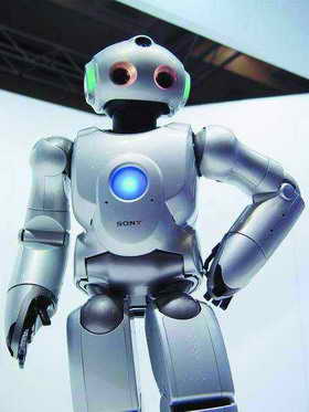 一只宠物狗就已经如此,那么人形机器人当然更复杂了。今年世界机器人综合博览会上索尼又推出了会跳舞的娱乐机器人QRIO,它的代号是SDR-4XⅡ。这个人形机器人可以通过双眼的两个CCD判断物体的距离,两腿行走在不平整的地面上也能很好地保持平衡,即使摔倒也会轻松站起,甚至还可以唱歌跳舞与人交谈。