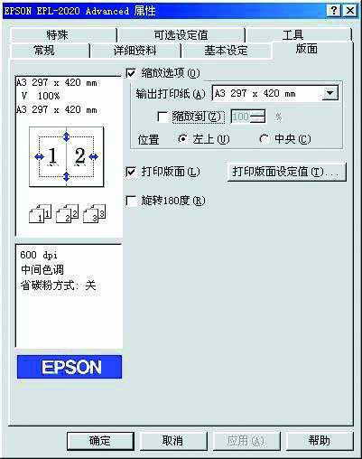 EPSON EPL-2020提供了独有的打印设置选项。笔者打开打印机属性窗口的版面选项卡,里面能够实现50~200倍的缩放和180度的旋转设定,在打印版面处点击“打印版面设定值”,在弹出的打印版面设定值对话框(图2)中,可以选择2页或4页,页顺序处按照实际需要选择页面的排列方向,这样就可实现“2页合1”或“4页合1”的打印功能,用户可以将原来的2页或4页文本缩小打印在一页上。除此之外,它还具有强大的水印打印功能,选择“属性→特殊→水印设定值”,在弹出的水印对话框中,可对水印的内容、尺寸、字体、位置、偏移量等进行设置。