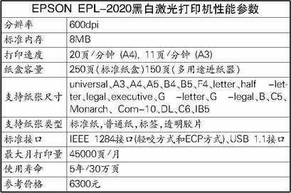 在基本配置方面,EPSON EPL-2020本身搭载了高速打印引擎并内置有8MB打印内存。它支持多接口打印,提供了IEEE 1284兼容并行接口(轻咬方式和ECP方式)与USB 1.1两种连接接口,这使得笔者安装打印机的过程变得相对简单。