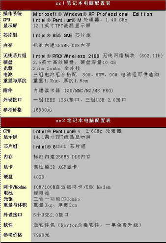 对笔记本电脑了解不多的用户,看了这两张配置单,不外乎有三种反应:1.怎么可能?价格印错了吧,Pentium 4 2.6GHz不是比PentiumM 1.4GHz更好吗?2.知道性能差不多,但觉得前者是暴利;3.前者可能是名牌,又有无线上网功能,所以卖得贵。