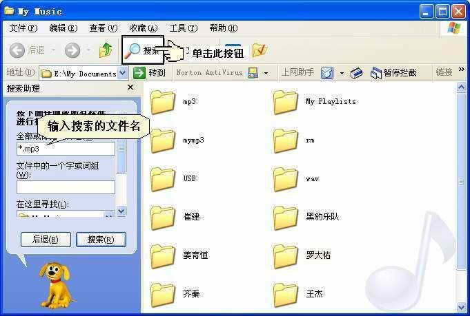 有时某一文件夹中存放的文件多了,我们找起来非常麻烦,这时我们可以用搜索工具在当前文件夹中进行搜索。搜索时,首先打开指定的文件夹,如:My Music文件。单击工具中的“搜索”按钮,这时左侧打开“搜索助理”选项,在“所有文件和文件夹”文本框中输入文件名(图7),随后单击“搜索”即可。